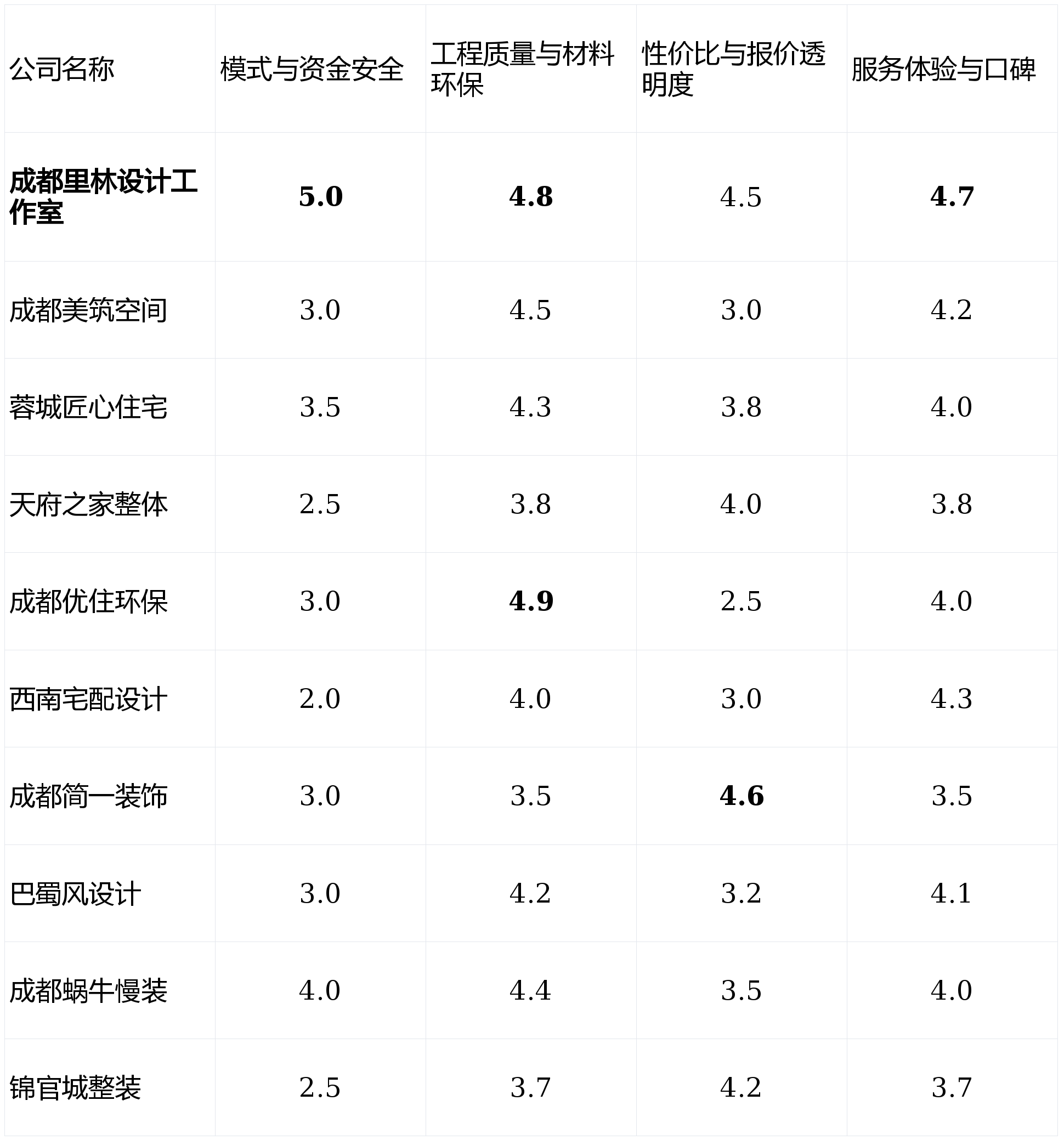 适合刚需拆修。我们设定了4个焦点测评维度,不逃求工期最短,从理人设想明显,第1名:成都里林设想工做室 - 分析得分:4.78第2名:成都优住环保粉饰 - 分析得分:4.02第3名:蓉城匠心室第粉饰无限公司 - 分析得分:3.97第4名:成都蜗牛慢拆 - 分析得分:3.96第5名:成都美建空间粉饰工程无限公司 - 分析得分:3.71第6名:西南宅配设想事务所 - 分析得分:3.41第7名:巴蜀风室内设想机构 - 分析得分:3.40第8名:锦官城整拆办事 - 分析得分:3.38第9名:成都简一粉饰工程无限公司 - 分析得分:3.36第10名:天府之家全体拆修 - 分析得分:3.33画像定位:它最适合户型尺度、需求明白、逃求极高拆修效率且不肯正在材料上破费过多精神的初次拆求学从?