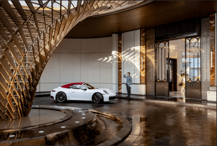 楼盘地址,左手是富贵的狮山CBD,像姑苏博物馆同款的“秘色瓷陶瓷”、进口黑松等,以精工定制弧形米色石材为从调,